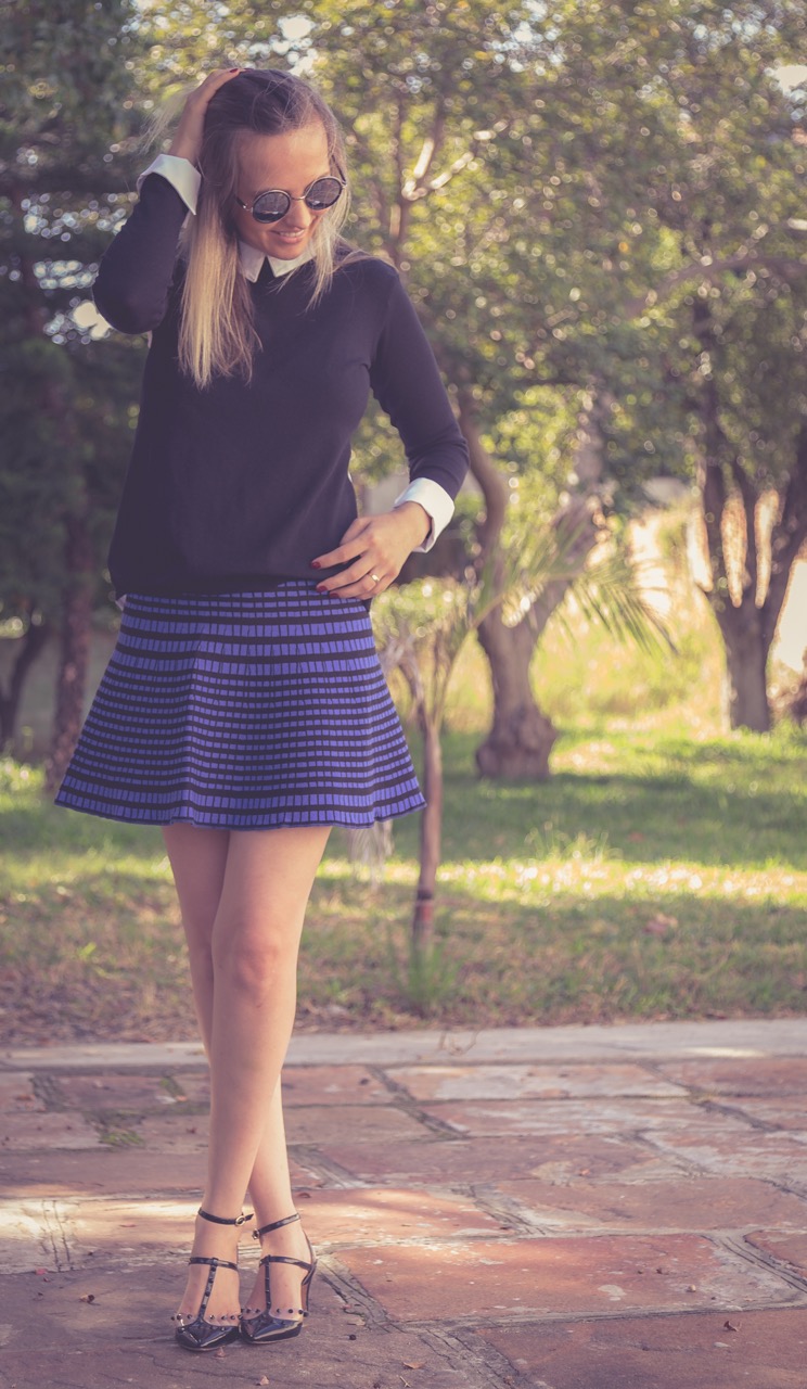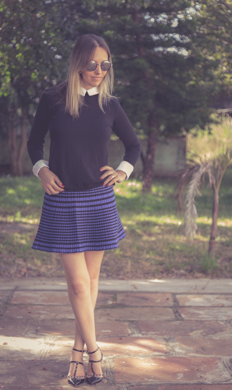 Ela usou Tricot preto com decote V (peça desejo para o inverno!), Saia de modal P&B e Blazer Capa (outra peça desejo…).
